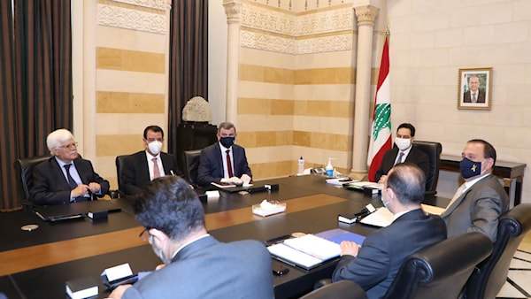 الوفد العراقي الذي توجه إلى لبنان غداة كارثة انفجار مرفأ بيروت، يطلع رئيس الحكومة اللبنانية حسان دياب على التقديمات الطبية العراقية التي وصلت إلى بيروت والتقديمات النفطية التي انطلقت من بغداد.