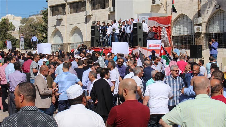 في وقفة أمام مجمع النقابات المهنية في إربد غداة وقف عمل نقابة المعلمين على خلفية اتهامات لأعضاء مجلس إدارتها - وكالة الأناضول