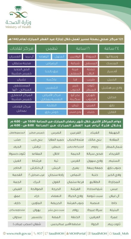 صحة عسير: 121 مركزا صحيا ولقاحات مناوبة خلال إجازة العيد