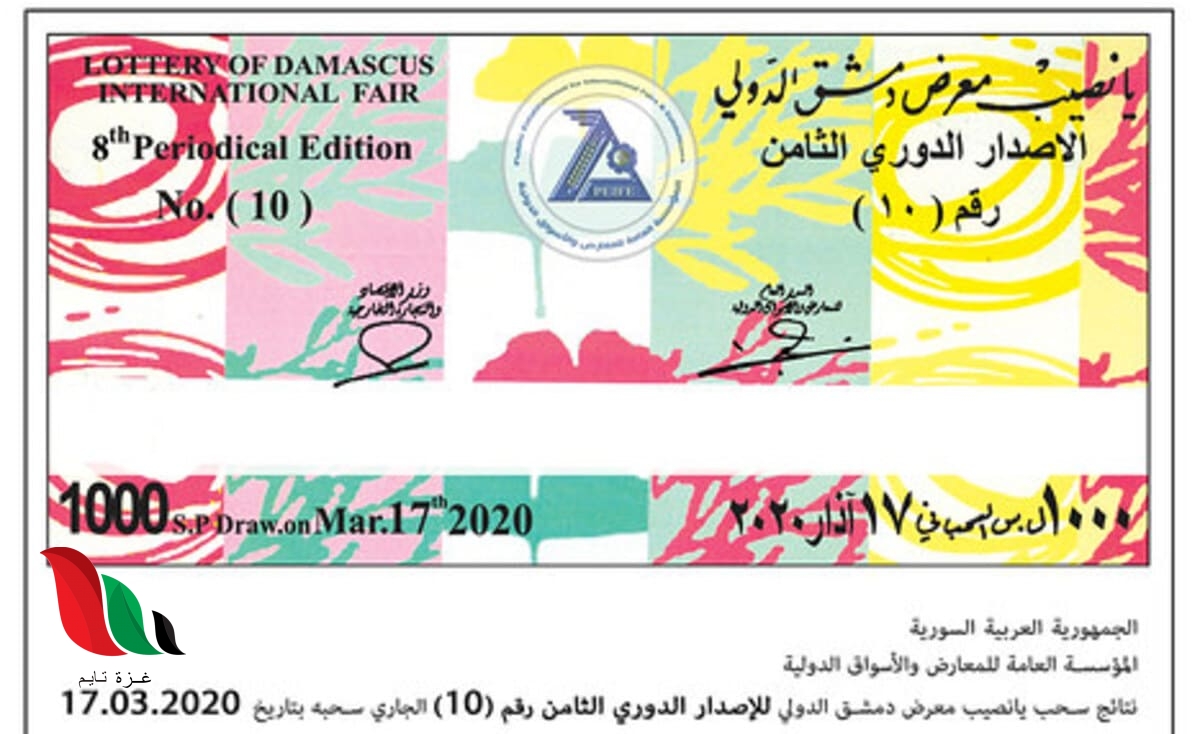 إليك نشرة نتائج سحب يانصيب معرض دمشق الدولي 2020 الإصدار الثامن رقم 10 اليوم الثلاثاء 17 اذار 2020، حيث تم الكشف عن الفائزين في بث مباشر على القناة السورية