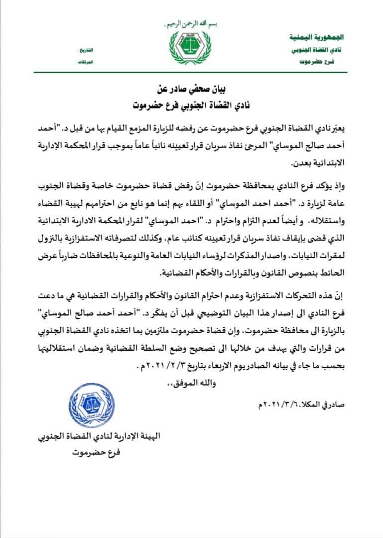 قضاة حضرموت يحددون موقفهم من النائب العام ..ويصدرون تصريح صحفي